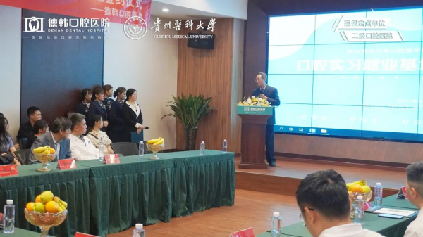 德韓口腔醫(yī)療集團高級常務(wù)副總裁呂艷、集團醫(yī)療總監(jiān)丁笑乙教授、貴陽德韓口腔醫(yī)院名譽院長羅洪教授、佘小明教授與貴州醫(yī)科大學(xué)口腔醫(yī)學(xué)院簽訂共建實習就業(yè)基地協(xié)議,共同開啟校企合作共育高技能人才新征程。