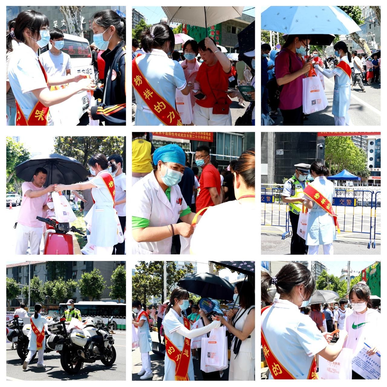 武漢仁愛醫(yī)院工作人員為考場(chǎng)外家長(zhǎng)、警察及環(huán)衛(wèi)工人送清涼