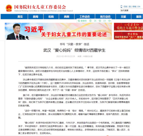 2022年年初,湖北省武漢市洪山區(qū)漢族家庭與西藏學(xué)生親情結(jié)對(duì)活動(dòng)得到了全國(guó)婦聯(lián)以及多家央媒關(guān)注,《中國(guó)婦女報(bào)》、國(guó)務(wù)院婦女兒童工作委員會(huì)官網(wǎng)、中華全國(guó)婦女聯(lián)合會(huì)···